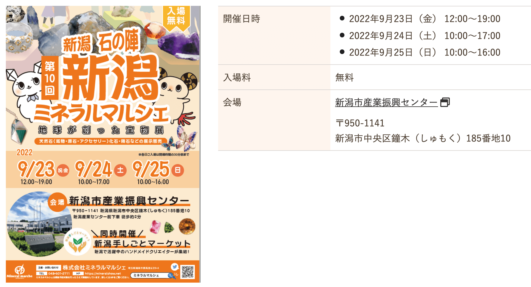 第10回新潟ミネラルマルシェ、2022年9月23日〜25日に開催! ニュース 2022/09/01 20:00 Chihaya まつり・イベント ミネラルマルシェ 鉱物 新潟ミネラルマルシェ|ミネラルマルシェ 天然石や化石などの展示即売会「新潟石の陣 第10回新潟ミネラルマルシェ」が今年も開催されるそうです。開催期間は2022年9月23日(金)〜9月25日(日)、会場は例年通り「新潟市産業振興センター」。「新潟手しごとマーケット」も同時開催されます。 続きを読む